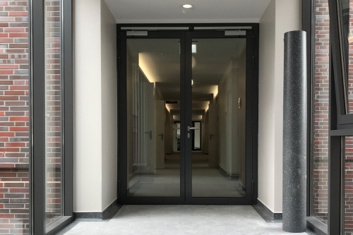 In der Fassadengestaltung sind die Nutzungen ablesebar. Das Erdgeschoss – der Sockel - wurde mit einer Putzfassade erstellt, die Obergeschosse haben eine Klinkerfassade erhalten, dessen Stein dem Bestand angepasst ist. Getrennt wurden der Neubau und das Bestandsgebäude durch eine „Fuge“, der Übergang zwischen den Bauteilen ist hier mit einer Pfosten-Riegel-Fassade und großzügigen Glasflächen hergestellt worden.