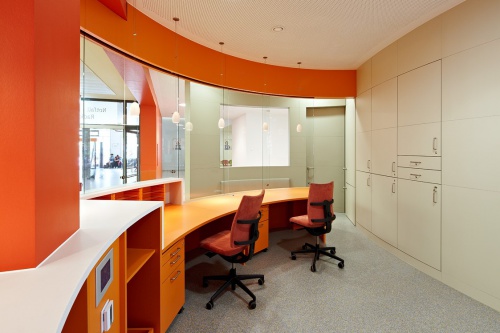 Staff now have a complete overview of the waiting area, lots of glass allows transparency but provides separation and protection. An acoustic ceiling was installed, and considerably more and better seating options were created, which also allow for quiet and retreat. The colour orange brings a smile to this often hectic place.